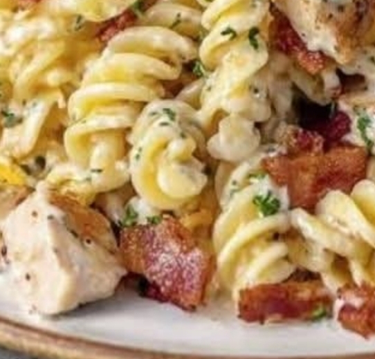 - Add the pasta to the skillet and use a silicone spatula to carefully combine with the sauce. Add the chicken and allow it to heat back up a bit. Garnish with bacon or stir it right into the sauce and serve!