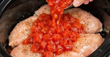 Place the boneless, skinless chicken breasts in a single layer on the bottom of the slow cooker. If the pieces are very thick, you can cut them in half crosswise so they cook more evenly and are easier to serve.