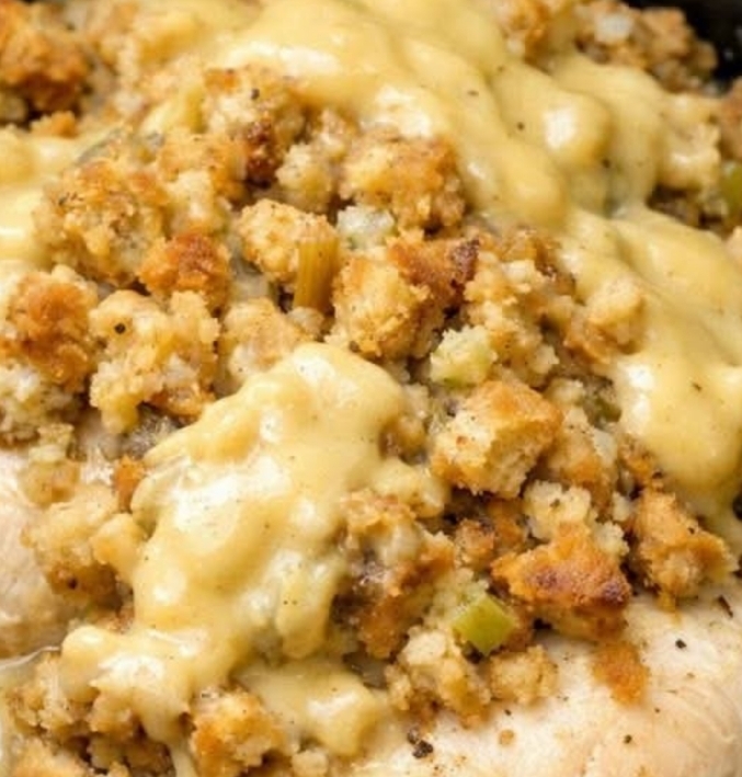 Sprinkle the dry seasoned stuffing mix evenly over the top of the sauce-covered chicken. Do not stir. You want the stuffing to sit on top so it can absorb steam and some surface moisture while still forming a golden, slightly crisp layer in spots.