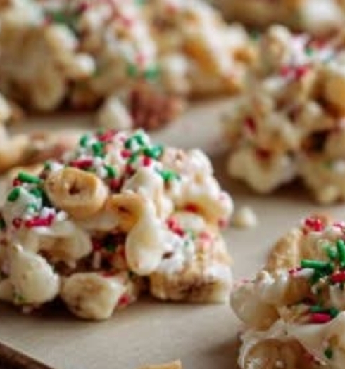 While the clusters are still soft, sprinkle the tops with holiday sprinkles or crushed peppermint candies, pressing very lightly so they adhere.