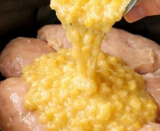 Open the cans of cream style corn and dump them evenly over the chicken breasts, spreading the corn so the chicken is mostly covered.